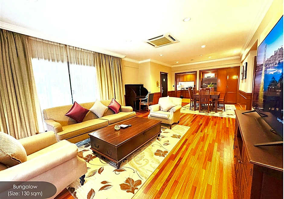 This spacious bungalow is consisted of of 1 living room, 2 separate bedrooms and 2 bathrooms with a bath and free toiletries. The air-conditioned bungalow offers a flat-screen TV with satellite channels, a mini-bar, a tea and coffee maker, a wardrobe as well as garden views. The unit offers 2 beds.